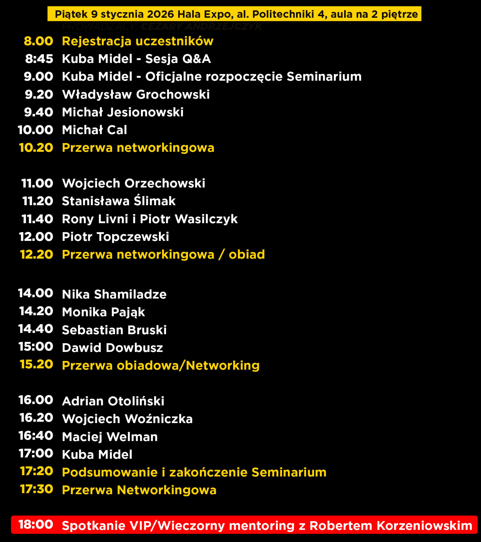 Prowadzący to doświadczeni przedsiębiorczy, inwestorzy i praktycy. Na seminarium dowiesz się jak skutecznie inwestować w nieruchomości 2026. Omówione zostaną wszystkie etapy procesu inwestycyjnego od pomysłu po stałe dochody pasywne lub zyski ze sprzedaży. Najważniejszą zaletą jest fakt, że na scenie pojawią się inwestorzy, którzy obrali odmienne strategie inwestycyjne, a każdy na swoim polu osiągnął sukces. Poznacie rynek kwater pracowniczych, sekrety deweloperki, zarządzania najmem, model budowy portfela mieszkań na wynajem oraz projektowania i urządzania wnętrz czy homestagingu. Wszystko po to, by coraz bardziej świadomie i skutecznie inwestować w nieruchomości.Podczas przerw networkingowych poznasz ludzi, którzy działają lub zamierzają inwestować w nieruchomości Zyskasz nie tylko ich doświadczenie, ale przede wszystkim cenne kontakty i znajomości.