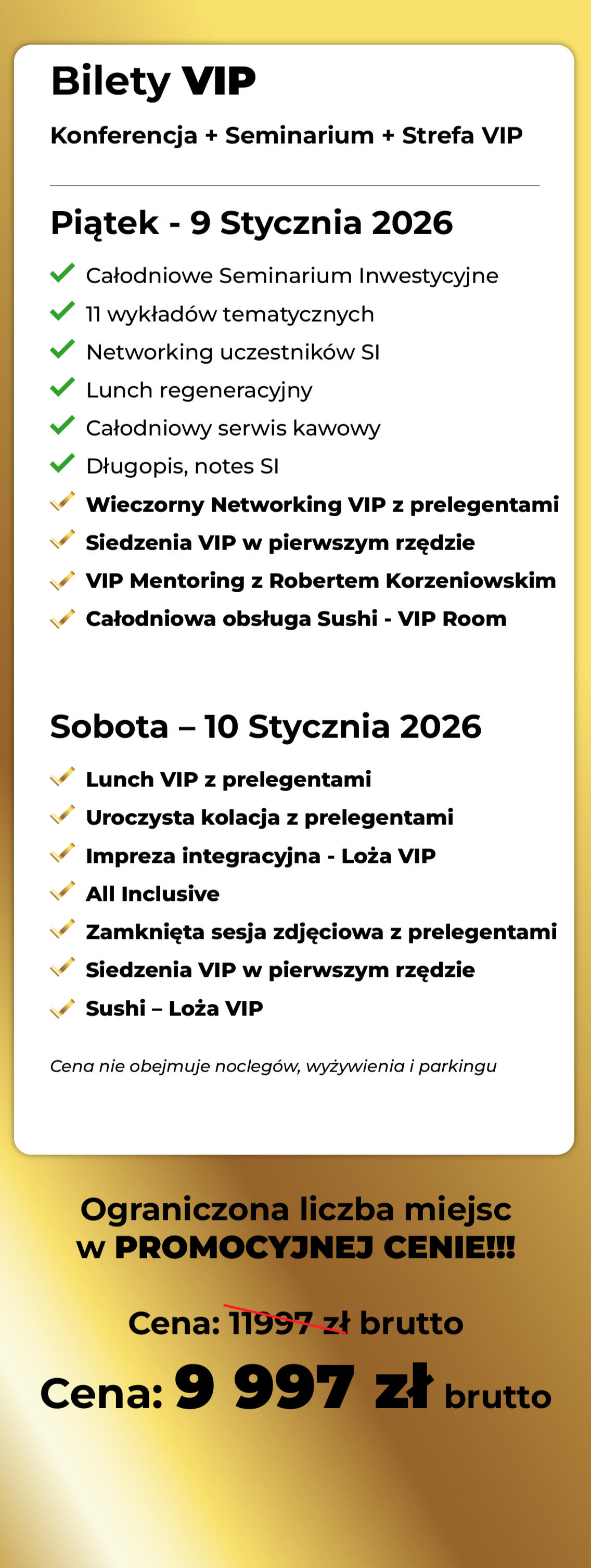 Prowadzący to doświadczeni przedsiębiorczy, inwestorzy i praktycy. Na seminarium dowiesz się jak skutecznie inwestować w nieruchomości 2026. Omówione zostaną wszystkie etapy procesu inwestycyjnego od pomysłu po stałe dochody pasywne lub zyski ze sprzedaży. Najważniejszą zaletą jest fakt, że na scenie pojawią się inwestorzy, którzy obrali odmienne strategie inwestycyjne, a każdy na swoim polu osiągnął sukces. Poznacie rynek kwater pracowniczych, sekrety deweloperki, zarządzania najmem, model budowy portfela mieszkań na wynajem oraz projektowania i urządzania wnętrz czy homestagingu. Wszystko po to, by coraz bardziej świadomie i skutecznie inwestować w nieruchomości.Podczas przerw networkingowych poznasz ludzi, którzy działają lub zamierzają inwestować w nieruchomości Zyskasz nie tylko ich doświadczenie, ale przede wszystkim cenne kontakty i znajomości.